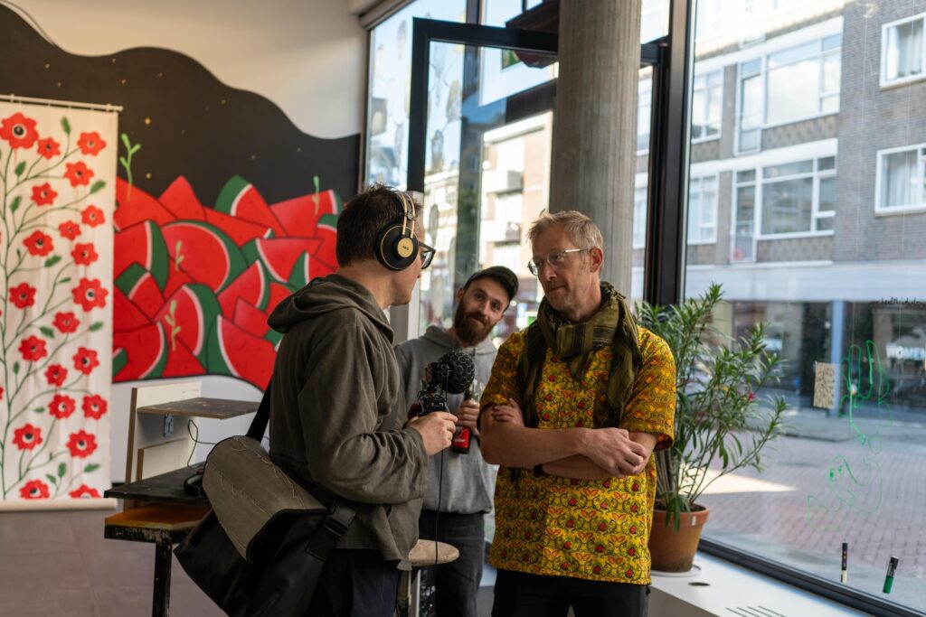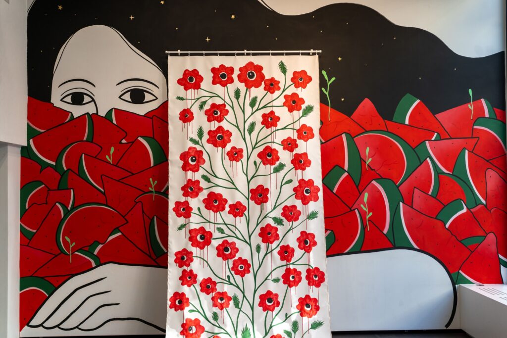 The poppy flowers (Anemone Coronaria) on the curtain symbolize their resilience and sacrifice. The curtain itself responds to the space, as it’s something before you entering a house, where inside there’s a kitchen, living room, shelves full of trinkets, wall full of memories and a garage. The curtains also serves a duality of division and unity, physically separates spaces while closed and also provide connections when opened. In contrast to that, the mural on the glass – people looking away whenever you look at them, reflects a disconnection i felt lately as if we are living in a different reality.