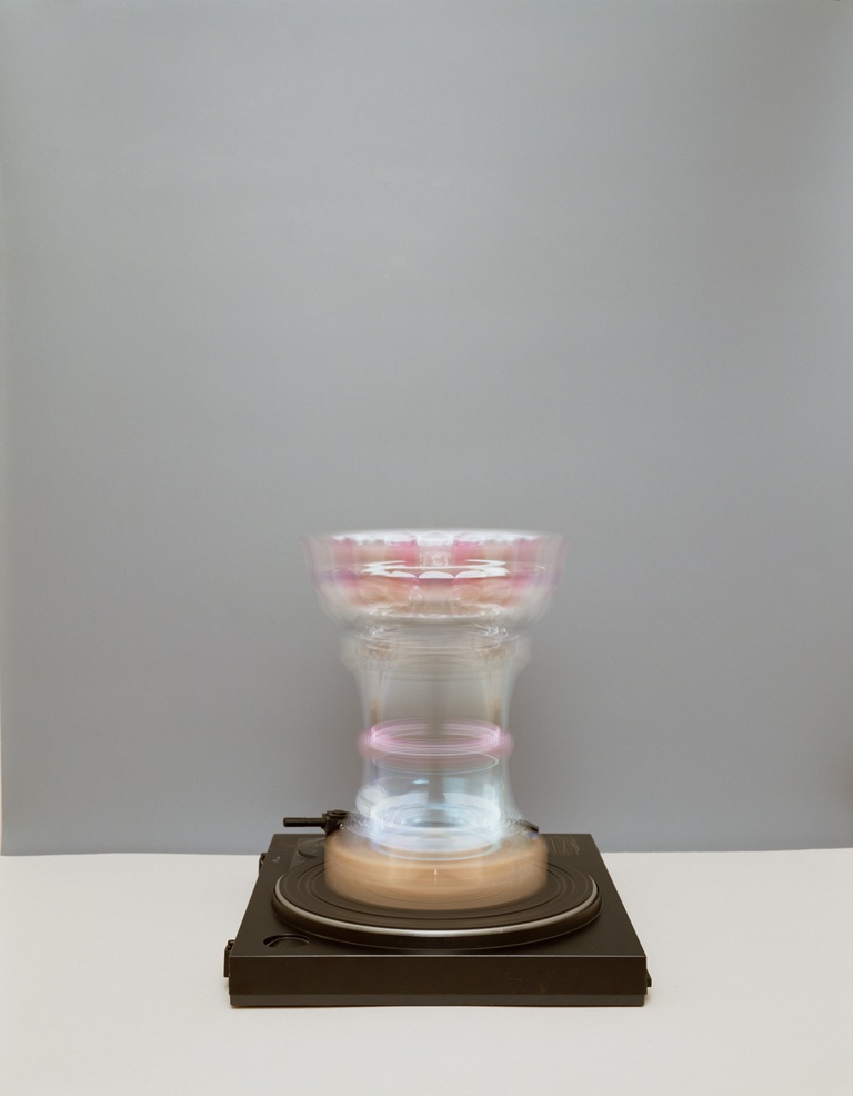The Hidden Objects series shows everyday household objects, such as a blue bin liner and a fruit case. These objects are put into motion by a record player. The turning movements are recorded by a camera with a long shutter speed. The suggestion of volume is created by adding this fourth dimension of time. The best possible use is made of the opportunity to create a false reality with photography. A ‘hidden object’ appears in the metamorphosis of the moving image.