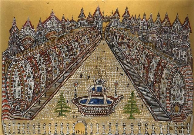 In 1960 Drago Jurak began to paint his spectacular buildings and cities, with ink and flowmaster on silk. Jurak always used a steep central perspective, which is why the human figures in his work look tiny compared to the gigantic buildings.